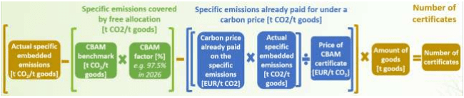 - 각 인증받은 CBAM 신고자가 반환해야 할 CBAM 인증서의 수량은 수입된 CBAM 상품의 양과 해당 상품에 포함된 실제 특정 배출량에 따라 결정됩니다. 이때, EU ETS(유럽 배출권 거래제)에서 무상 할당으로 이미 적용된 특정 배출량(무상할당 조정, SEFA)과 원산지 국가에서 실질적으로 지불된 탄소 가격으로 이미 적용된 특정 배출량(해당되는 경우)이 차감됩니다.