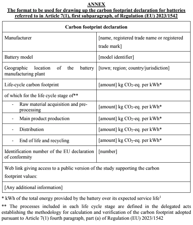 이 규정은 전기차 배터리, 2kWh 이상의 충전식 산업용 배터리 및 경량 운송 수단(LMT) 배터리를 제조하는 기업이 각 배터리 모델에 대해 제조 공장별 탄소 발자국을 공개하도록 요구합니다.