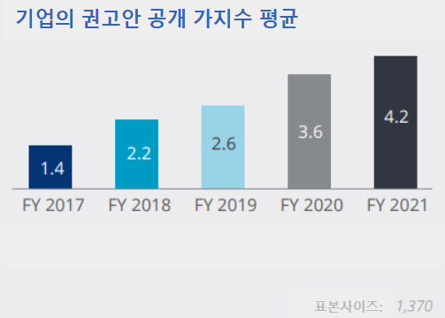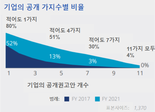 지난 3년간 모든 지역에서 공개 수준이 상당한 수준으로 증가했습니다. 특히 지난 2021년 유럽 기업의 경우 11개 권장 공개에 관한 평균 공개 수준은 60%였습니다. 이는 2019년 이후 23% 증가한 수치입니다. 아시아 태평양 기업의 경우 36%로 11% 증가했고, 북미 기업의 경우 29%로 12% 증가한 수치입니다.